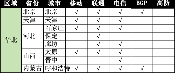 | 华北 | 北京 | 北京 | √ | √ | √ | √ | |